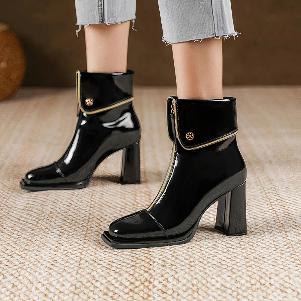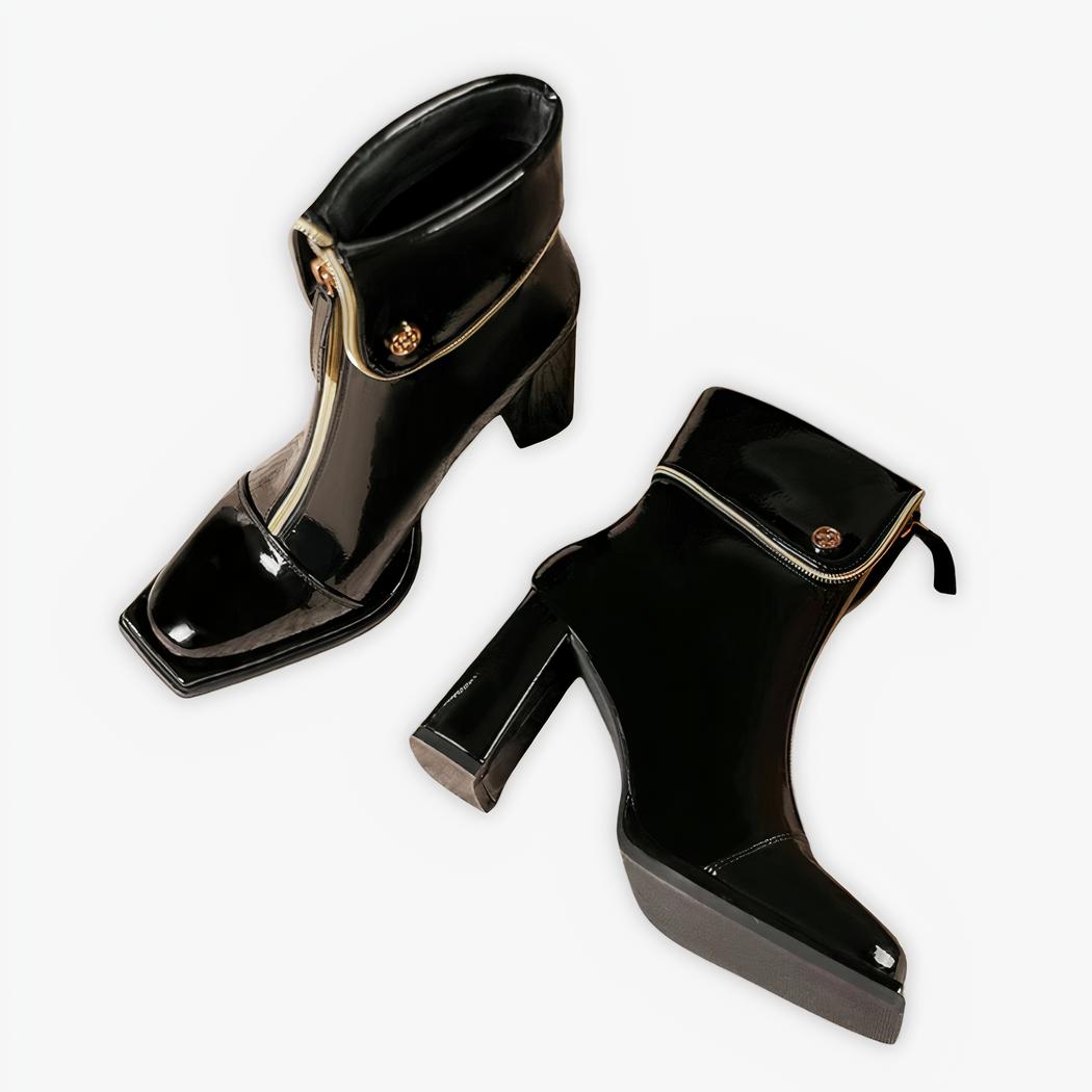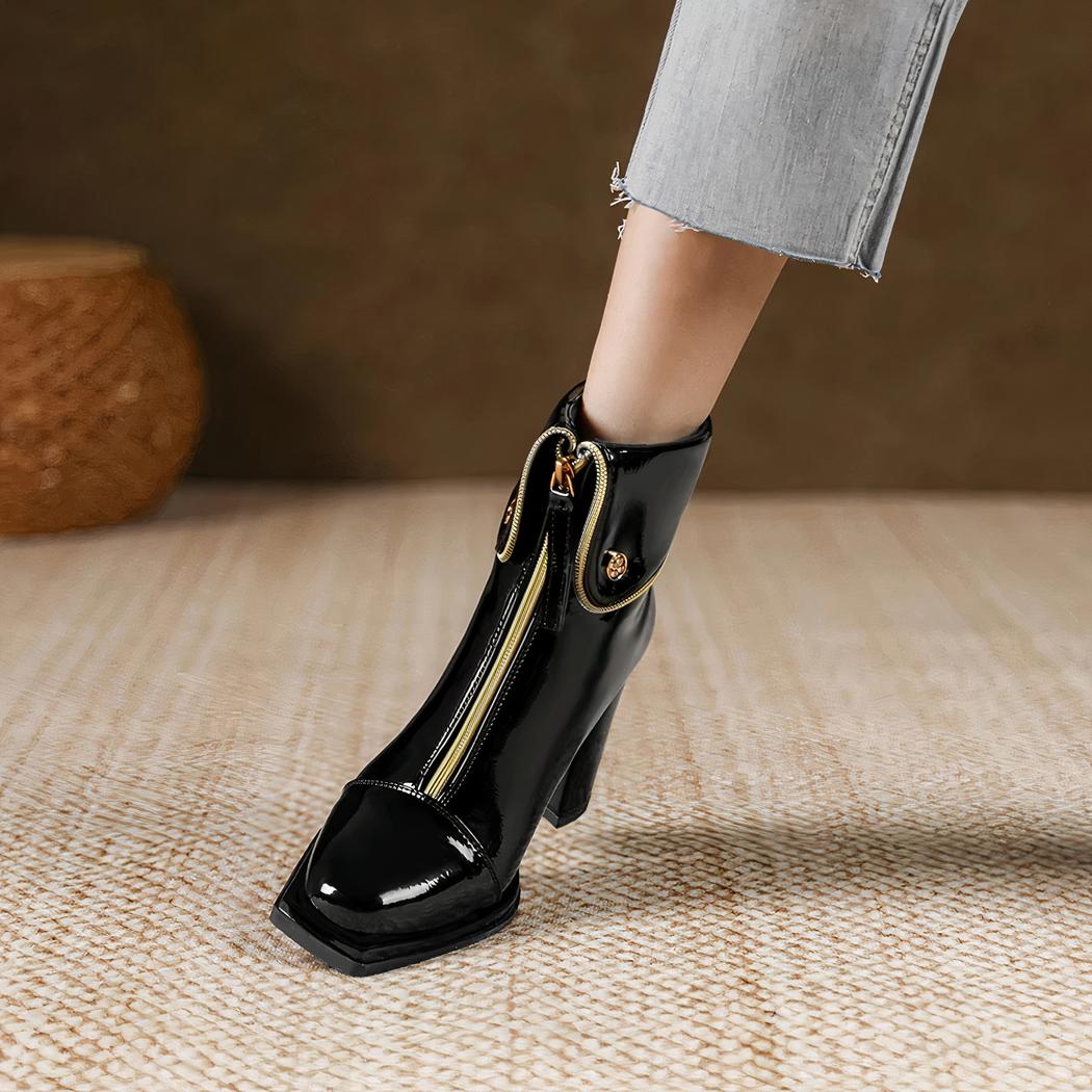 Découvrez le raffinement ultime avec ces santiags en simili cuir noir brillant, embellies d'une fermeture éclair dorée. Leur talon haut et le bout carré épuré les rendent parfaites pour compléter une tenue chic, leur donnant une touche d'éclat sans pareille pour des événements de soirée ou des réunions importantes.