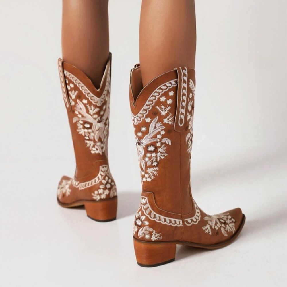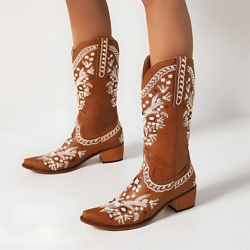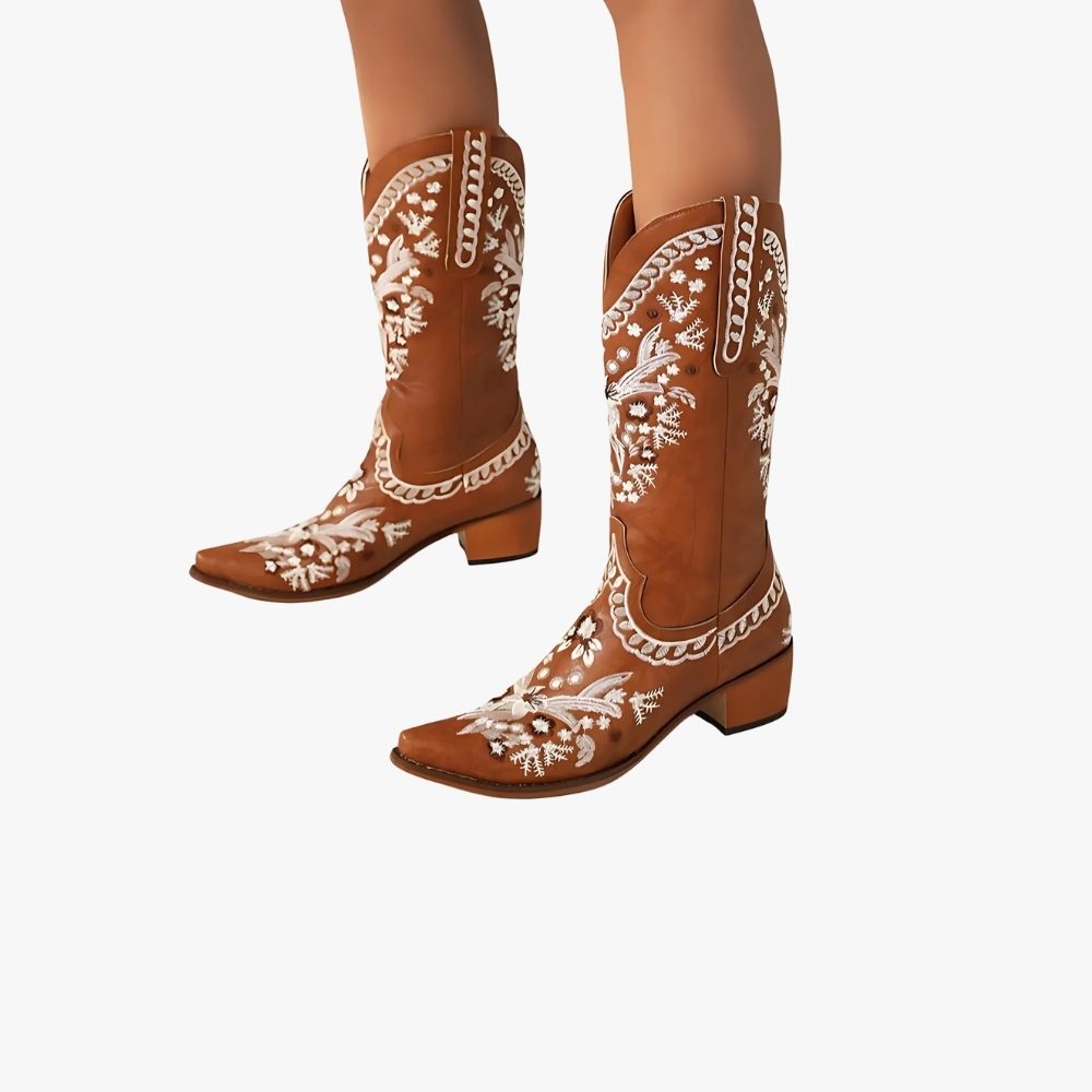 L'esthétique de ces santiags est définie par les motifs floraux brodés qui ornent le simili cuir marron, offrant un contraste visuel frappant et une touche de féminité. Chaque détail est pensé pour mettre en valeur la silhouette tout en restant fidèle à l'esprit cowboy.