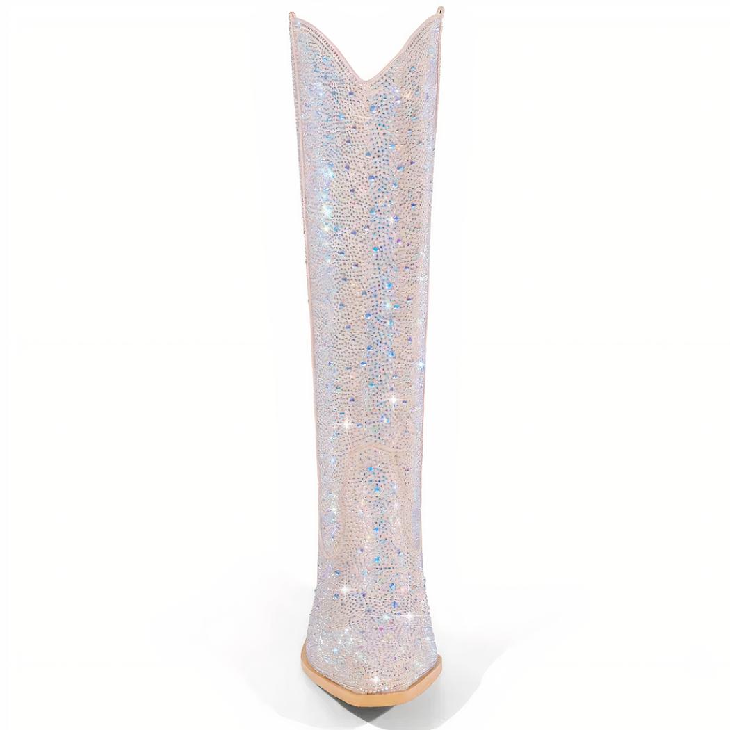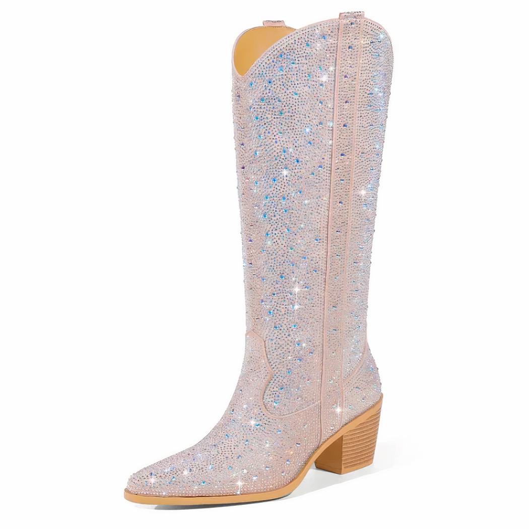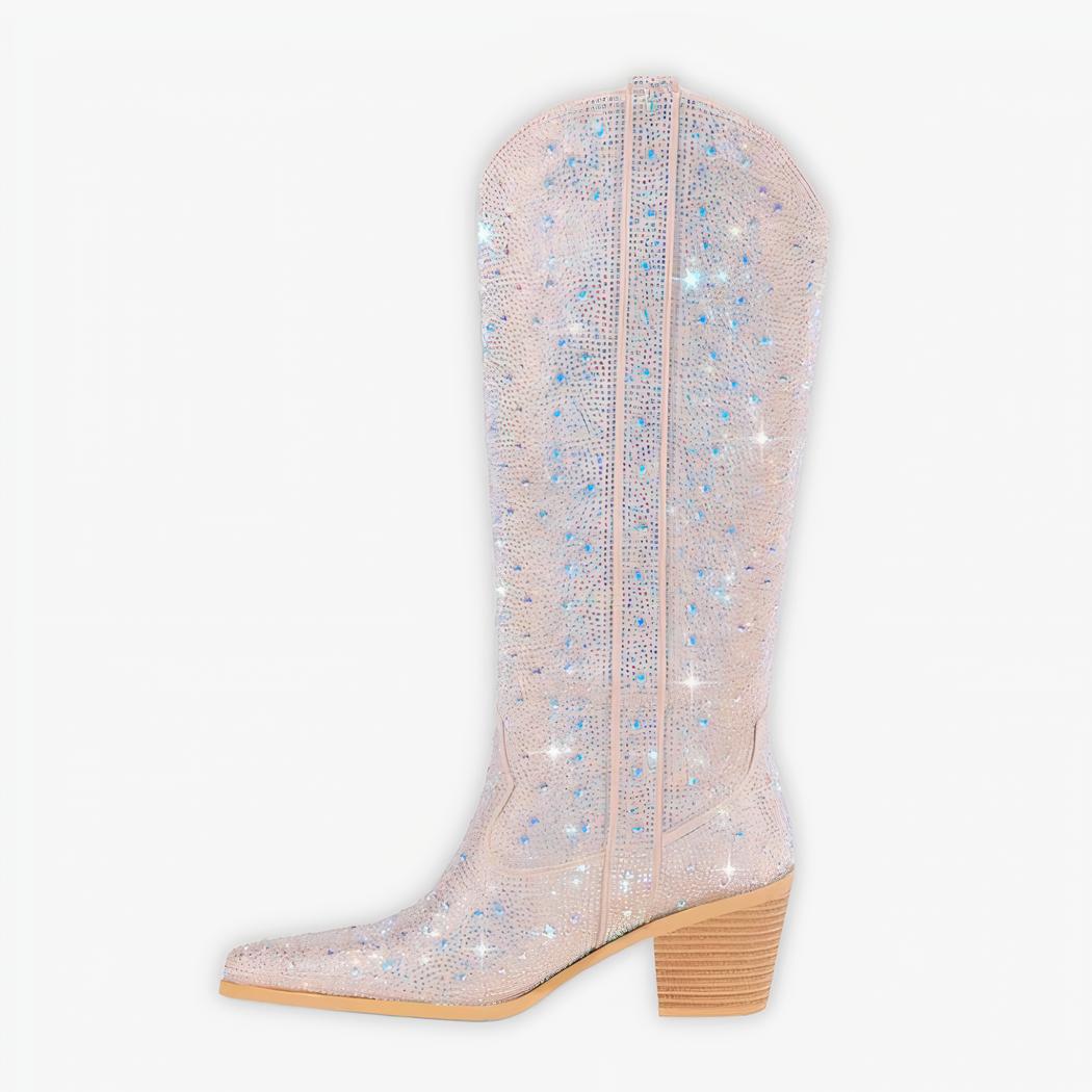 Redéfinissez le chic avec ces santiags hautes en nubuck. Leur couleur beige neutre et les strass scintillants se marient parfaitement pour offrir un look sophistiqué et contemporain. Idéales pour les sorties en ville ou les occasions spéciales, elles vous assurent de ne jamais passer inaperçue.