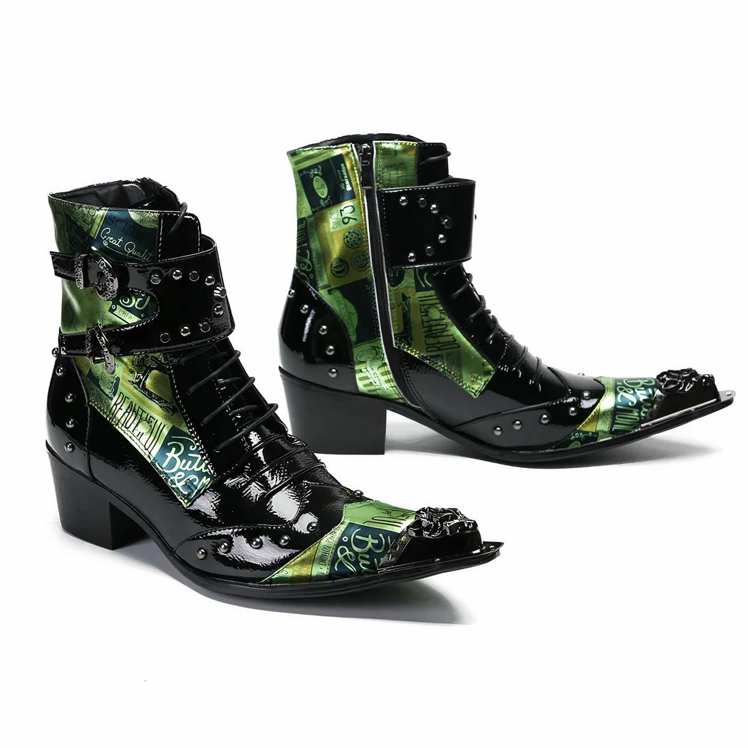 Fabriquées en cuir haut de gamme et dotées d'une semelle en caoutchouc résistant, ces santiags vertes sont conçues pour durer. Les détails cloutés ne sont pas seulement esthétiques, ils renforcent également la structure des bottines, tandis que les lacets et les doubles boucles offrent un ajustement personnalisable et sécurisé. Ces caractéristiques font de ces santiags un choix parfait pour les conditions hivernales rigoureuses, alliant fonctionnalité et style audacieux.