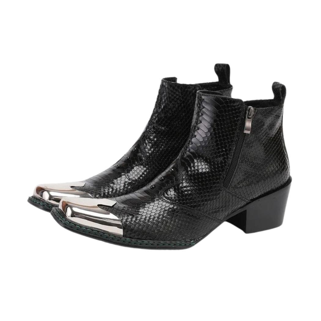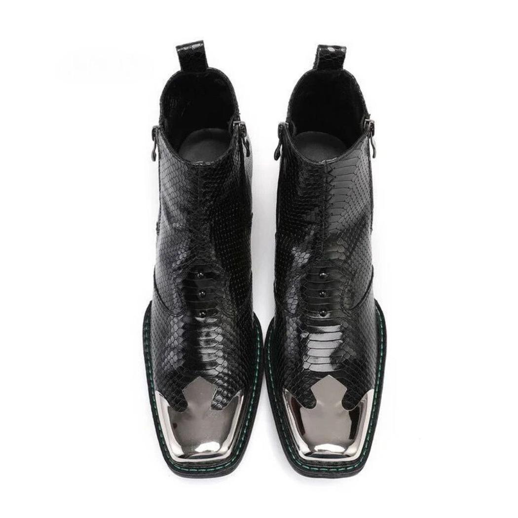 Le motif effet peau de serpent sur ces santiags en cuir noir apporte une texture riche et un visuel distinctif. Ce design unique fait de ces chaussures un excellent choix pour ceux qui recherchent à se démarquer, offrant une sophistication et un style qui attirent le regard lors de toute occasion.
