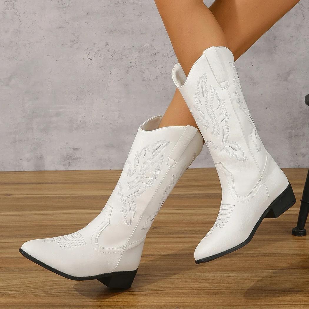 Santiag blanche élégante et mi haute avec broderies pour femme