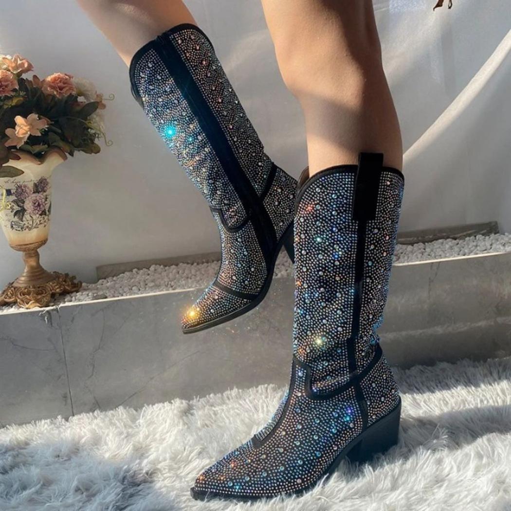 Portez l'éclat du quotidien avec ces santiags noires brillantes. Elles combinent la robustesse avec l'éclat des strass pour un effet à la fois chic et audacieux. Idéales pour celles qui veulent se démarquer sans sacrifier le confort, elles sont parfaites pour une journée de travail transformée en soirée impromptue.