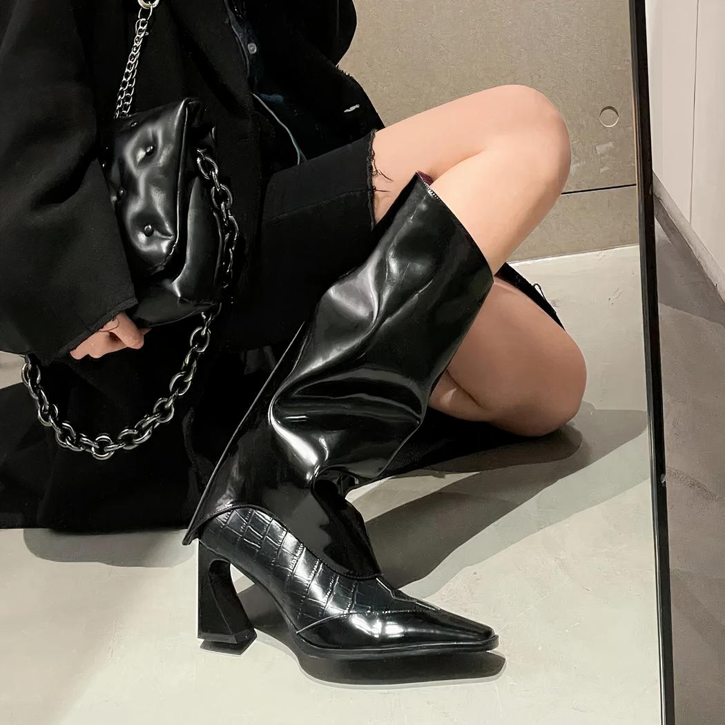 Avec leur silhouette épurée et leur finition noire brillante, ces santiags mollet large apportent une touche de raffinement à n'importe quelle tenue. Le talon modéré ajoute juste assez de hauteur pour rehausser votre look sans compromettre le confort. Que vous les portiez avec des jeans ou une jupe, ces bottes polyvalentes s'adaptent à tout style, du casual au plus formel.